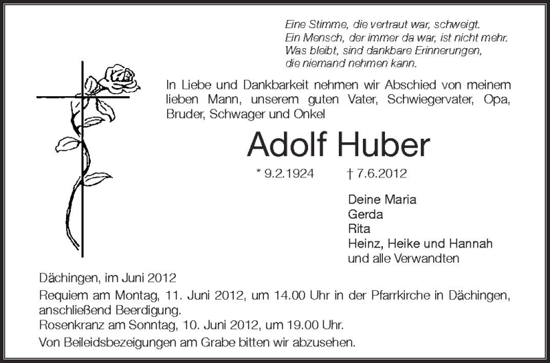 Hier finden Sie alle Traueranzeigen aus der Zeitung, die bisher für Adolf Huber erschienen sind. Weitere Traueranzeigen, die in der Zeitung erscheinen, werden hier ebenfalls aufgelistet