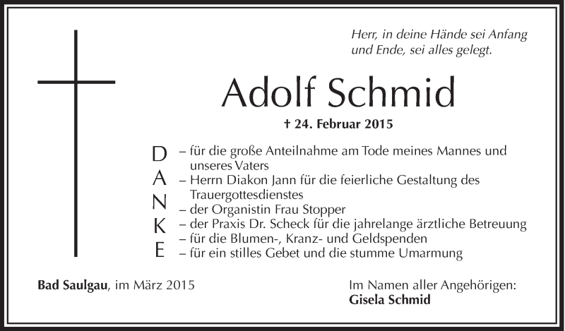Hier finden Sie alle Traueranzeigen aus der Zeitung, die bisher für Adolf Schmid erschienen sind. Weitere Traueranzeigen, die in der Zeitung erscheinen, werden hier ebenfalls aufgelistet