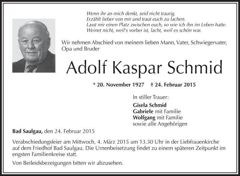Hier finden Sie alle Traueranzeigen aus der Zeitung, die bisher für Adolf Kaspar Schmid erschienen sind. Weitere Traueranzeigen, die in der Zeitung erscheinen, werden hier ebenfalls aufgelistet