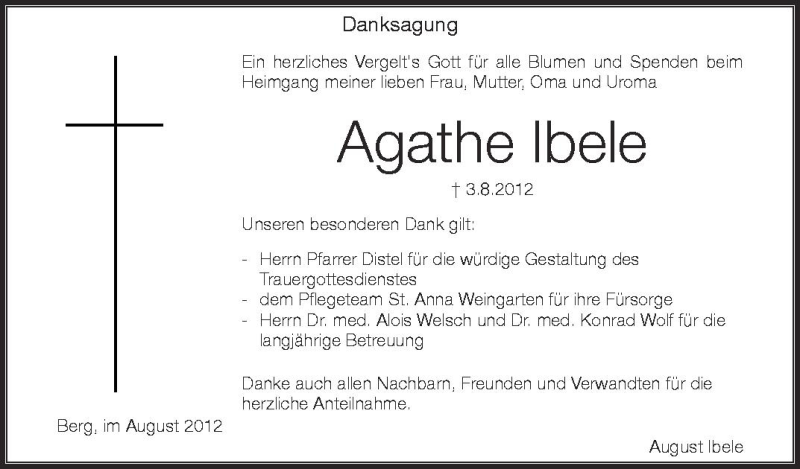 Hier finden Sie alle Traueranzeigen aus der Zeitung, die bisher für Agathe Ibele erschienen sind. Weitere Traueranzeigen, die in der Zeitung erscheinen, werden hier ebenfalls aufgelistet
