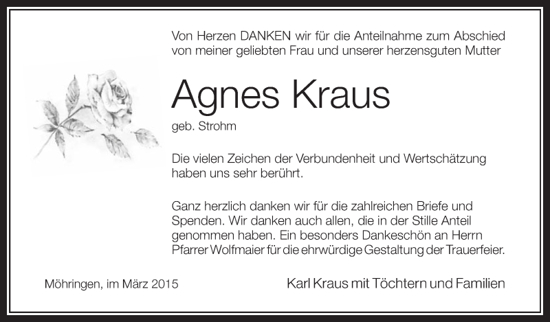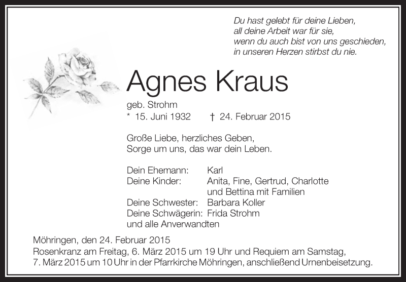 Hier finden Sie alle Traueranzeigen aus der Zeitung, die bisher für Agnes Kraus erschienen sind. Weitere Traueranzeigen, die in der Zeitung erscheinen, werden hier ebenfalls aufgelistet