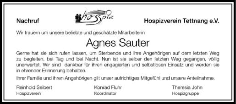Hier finden Sie alle Traueranzeigen aus der Zeitung, die bisher für Agnes Sauter erschienen sind. Weitere Traueranzeigen, die in der Zeitung erscheinen, werden hier ebenfalls aufgelistet