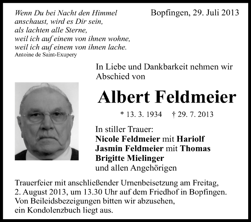 Hier finden Sie alle Traueranzeigen aus der Zeitung, die bisher für Albert Feldmeier erschienen sind. Weitere Traueranzeigen, die in der Zeitung erscheinen, werden hier ebenfalls aufgelistet