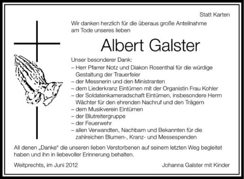 Hier finden Sie alle Traueranzeigen aus der Zeitung, die bisher für Albert Galster erschienen sind. Weitere Traueranzeigen, die in der Zeitung erscheinen, werden hier ebenfalls aufgelistet