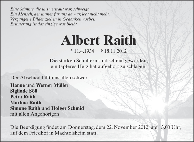 Hier finden Sie alle Traueranzeigen aus der Zeitung, die bisher für Albert Raith erschienen sind. Weitere Traueranzeigen, die in der Zeitung erscheinen, werden hier ebenfalls aufgelistet