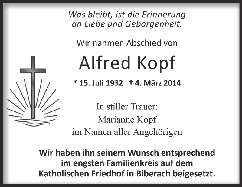 Hier finden Sie alle Traueranzeigen aus der Zeitung, die bisher für Alfred Kopf erschienen sind. Weitere Traueranzeigen, die in der Zeitung erscheinen, werden hier ebenfalls aufgelistet