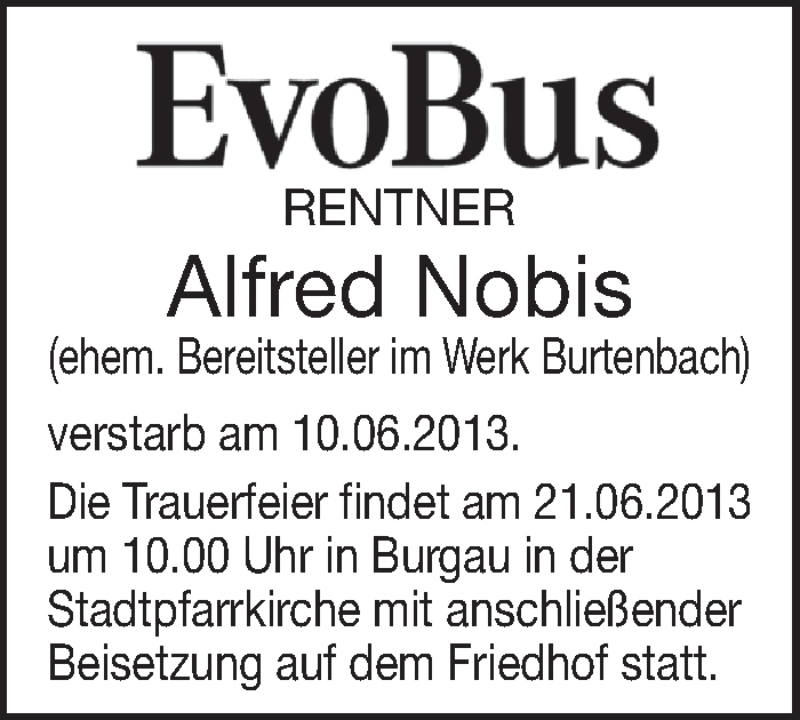 Hier finden Sie alle Traueranzeigen aus der Zeitung, die bisher für Alfred Nobis erschienen sind. Weitere Traueranzeigen, die in der Zeitung erscheinen, werden hier ebenfalls aufgelistet