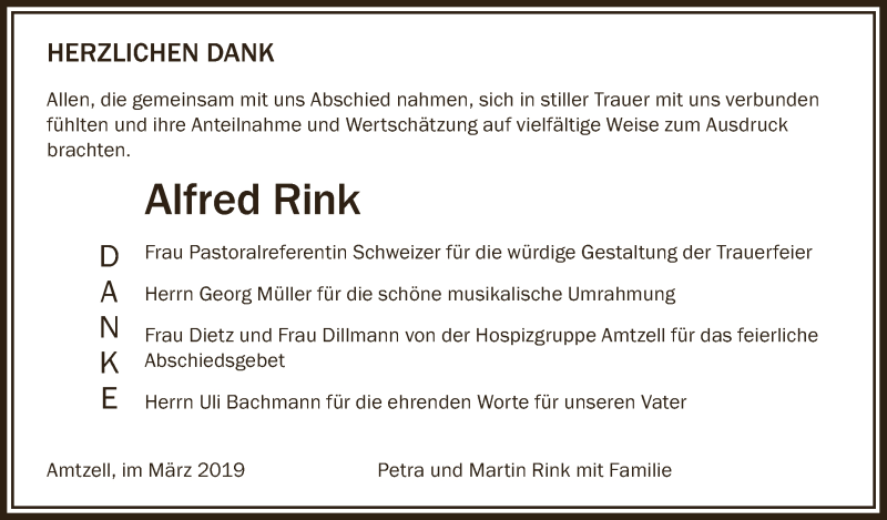 Hier finden Sie alle Traueranzeigen aus der Zeitung, die bisher für Alfred Rink erschienen sind. Weitere Traueranzeigen, die in der Zeitung erscheinen, werden hier ebenfalls aufgelistet
