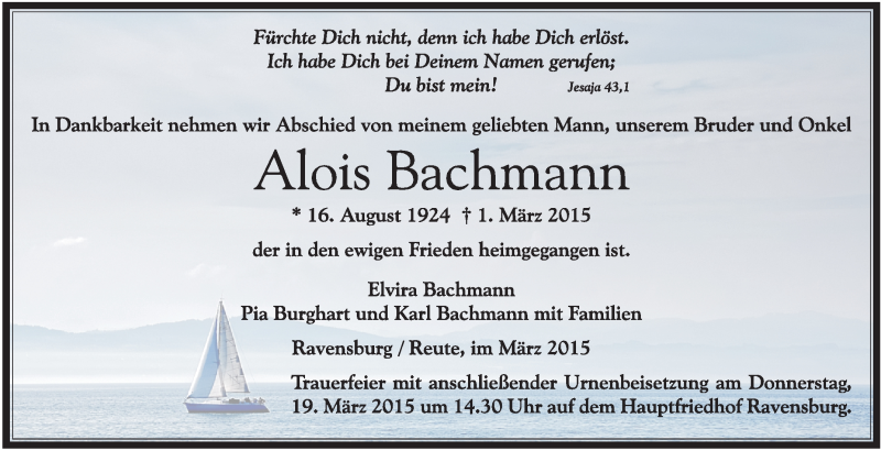 Hier finden Sie alle Traueranzeigen aus der Zeitung, die bisher für Alois Bachmann erschienen sind. Weitere Traueranzeigen, die in der Zeitung erscheinen, werden hier ebenfalls aufgelistet