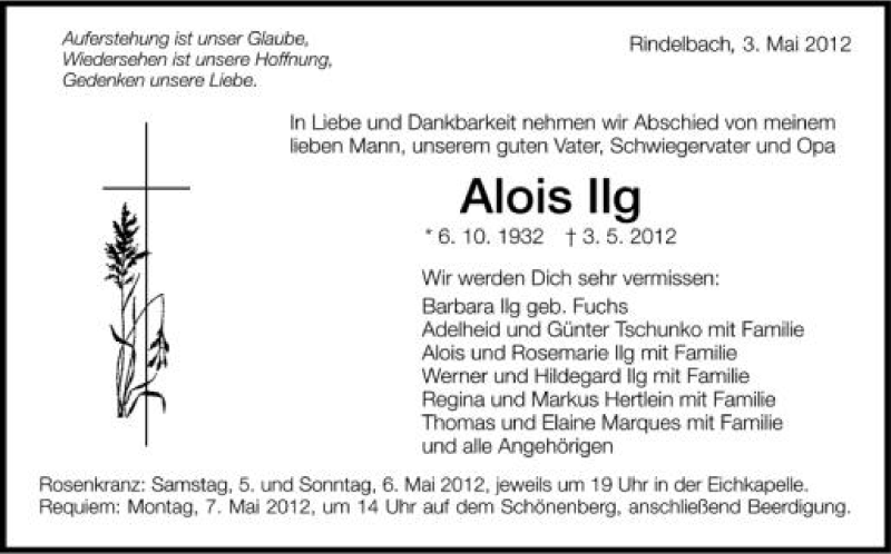 Hier finden Sie alle Traueranzeigen aus der Zeitung, die bisher für Alois Ilg erschienen sind. Weitere Traueranzeigen, die in der Zeitung erscheinen, werden hier ebenfalls aufgelistet