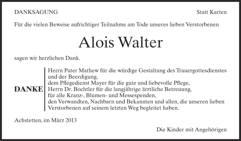 Hier finden Sie alle Traueranzeigen aus der Zeitung, die bisher für Alois Walter erschienen sind. Weitere Traueranzeigen, die in der Zeitung erscheinen, werden hier ebenfalls aufgelistet