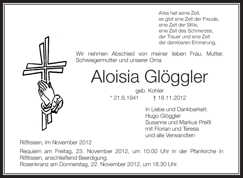 Hier finden Sie alle Traueranzeigen aus der Zeitung, die bisher für Aloisia Glöggler erschienen sind. Weitere Traueranzeigen, die in der Zeitung erscheinen, werden hier ebenfalls aufgelistet