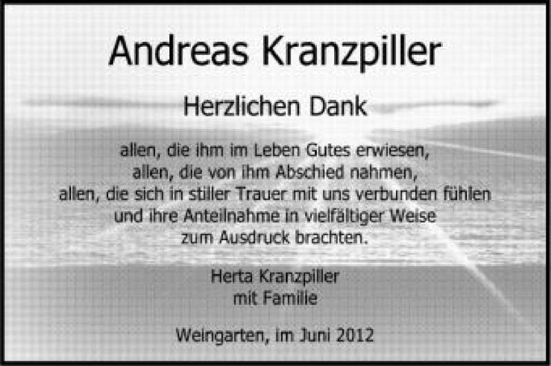 Hier finden Sie alle Traueranzeigen aus der Zeitung, die bisher für Andreas Kranzpiller erschienen sind. Weitere Traueranzeigen, die in der Zeitung erscheinen, werden hier ebenfalls aufgelistet