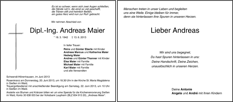 Hier finden Sie alle Traueranzeigen aus der Zeitung, die bisher für Andreas Maier erschienen sind. Weitere Traueranzeigen, die in der Zeitung erscheinen, werden hier ebenfalls aufgelistet