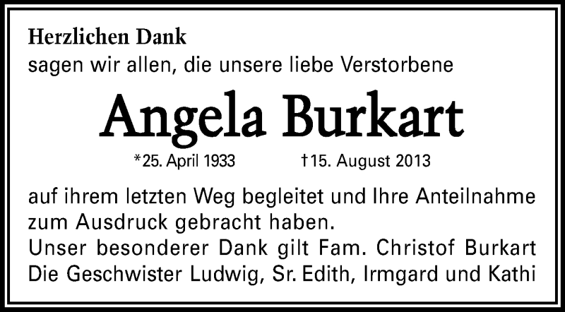 Hier finden Sie alle Traueranzeigen aus der Zeitung, die bisher für Angela Burkart erschienen sind. Weitere Traueranzeigen, die in der Zeitung erscheinen, werden hier ebenfalls aufgelistet