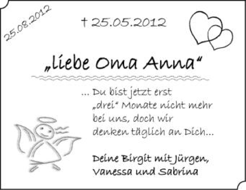 Hier finden Sie alle Traueranzeigen aus der Zeitung, die bisher für Anna Burkhart erschienen sind. Weitere Traueranzeigen, die in der Zeitung erscheinen, werden hier ebenfalls aufgelistet