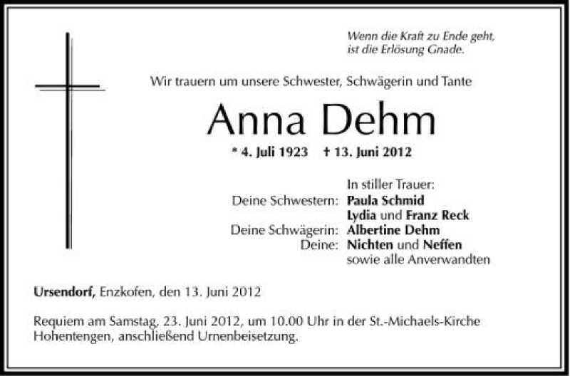 Hier finden Sie alle Traueranzeigen aus der Zeitung, die bisher für Anna Dehm erschienen sind. Weitere Traueranzeigen, die in der Zeitung erscheinen, werden hier ebenfalls aufgelistet