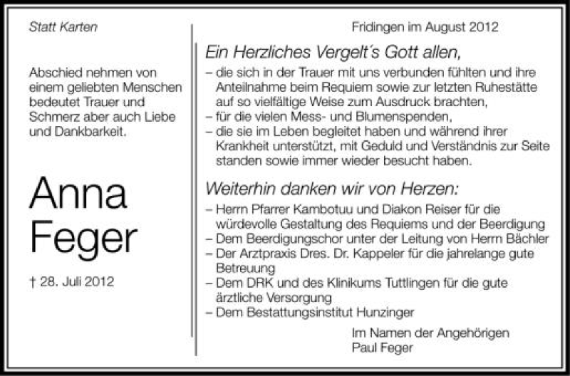 Hier finden Sie alle Traueranzeigen aus der Zeitung, die bisher für Anna Feger erschienen sind. Weitere Traueranzeigen, die in der Zeitung erscheinen, werden hier ebenfalls aufgelistet