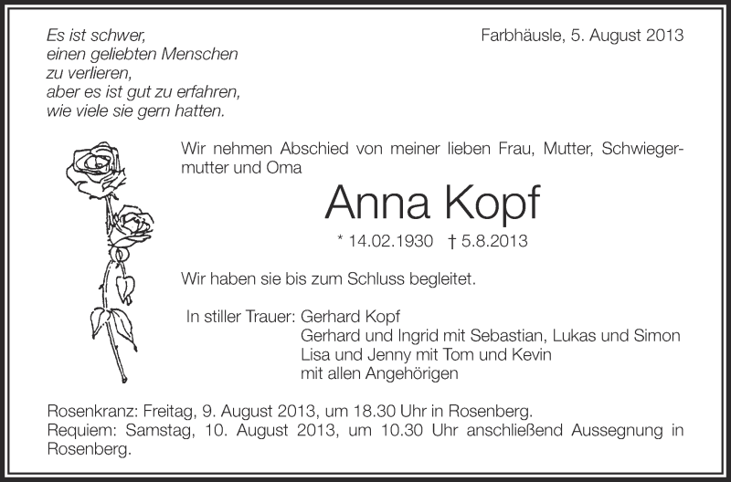 Hier finden Sie alle Traueranzeigen aus der Zeitung, die bisher für Anna Kopf erschienen sind. Weitere Traueranzeigen, die in der Zeitung erscheinen, werden hier ebenfalls aufgelistet