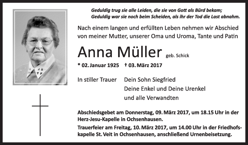 Hier finden Sie alle Traueranzeigen aus der Zeitung, die bisher für Anna Müller erschienen sind. Weitere Traueranzeigen, die in der Zeitung erscheinen, werden hier ebenfalls aufgelistet