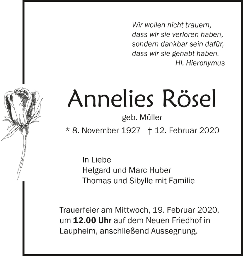 Hier finden Sie alle Traueranzeigen aus der Zeitung, die bisher für Annelies Rösel erschienen sind. Weitere Traueranzeigen, die in der Zeitung erscheinen, werden hier ebenfalls aufgelistet