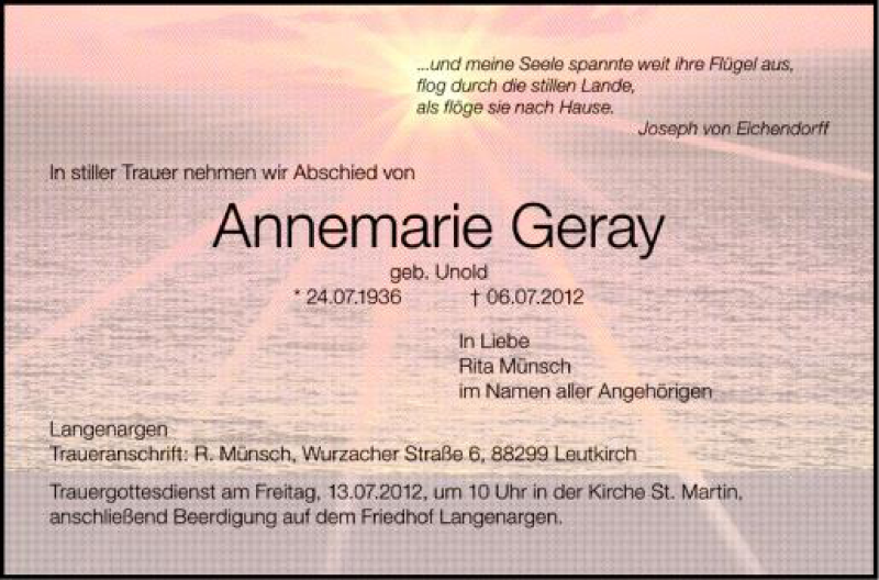 Hier finden Sie alle Traueranzeigen aus der Zeitung, die bisher für Annemarie Geray erschienen sind. Weitere Traueranzeigen, die in der Zeitung erscheinen, werden hier ebenfalls aufgelistet