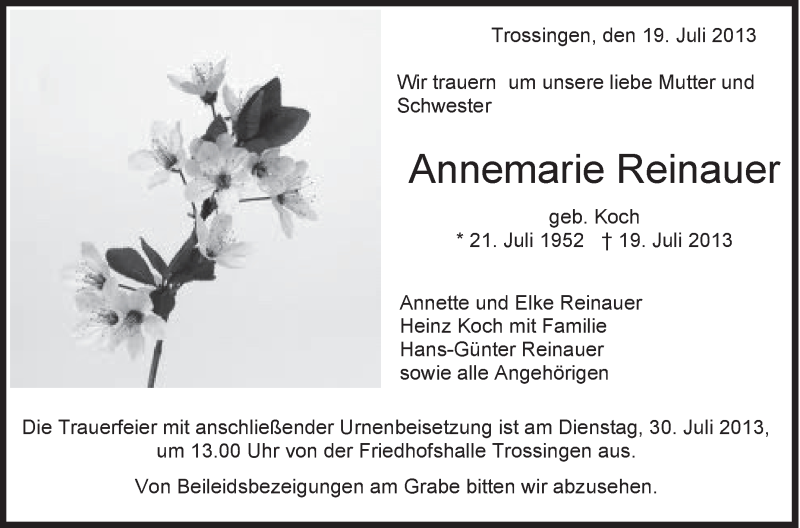 Hier finden Sie alle Traueranzeigen aus der Zeitung, die bisher für Annemarie Reinauer erschienen sind. Weitere Traueranzeigen, die in der Zeitung erscheinen, werden hier ebenfalls aufgelistet