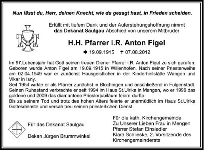 Hier finden Sie alle Traueranzeigen aus der Zeitung, die bisher für Anton Figel erschienen sind. Weitere Traueranzeigen, die in der Zeitung erscheinen, werden hier ebenfalls aufgelistet