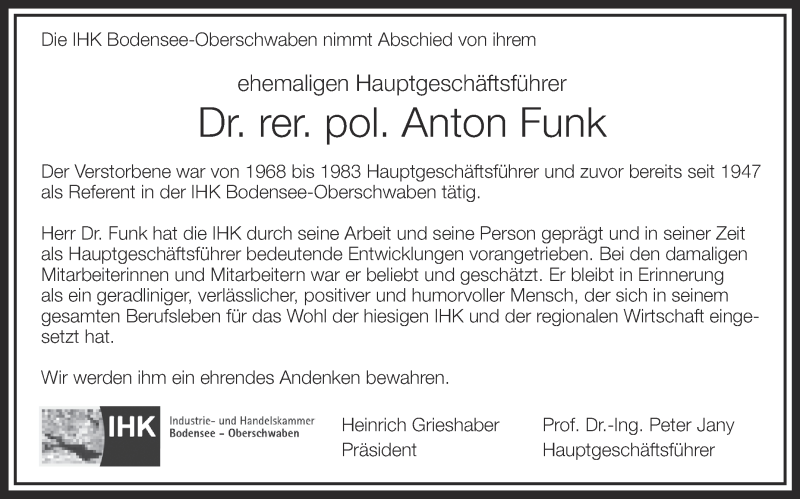 Hier finden Sie alle Traueranzeigen aus der Zeitung, die bisher für Anton Funk erschienen sind. Weitere Traueranzeigen, die in der Zeitung erscheinen, werden hier ebenfalls aufgelistet