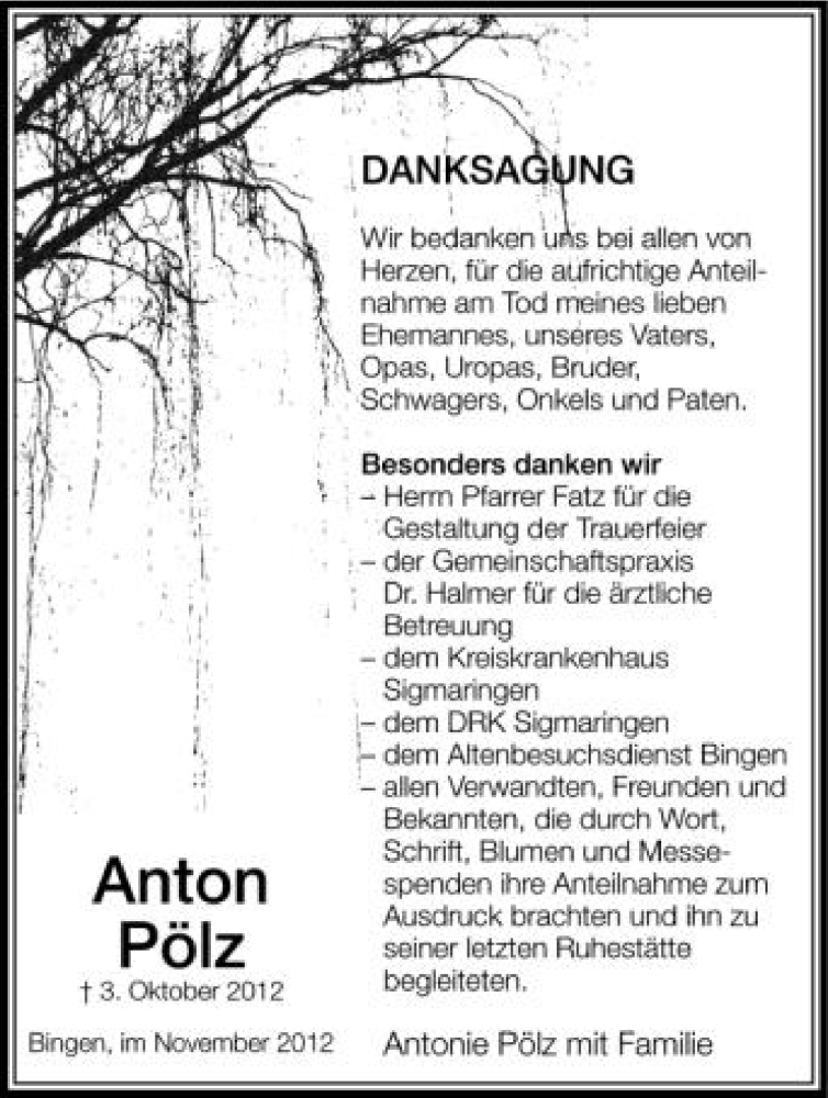 Hier finden Sie alle Traueranzeigen aus der Zeitung, die bisher für Anton Pölz erschienen sind. Weitere Traueranzeigen, die in der Zeitung erscheinen, werden hier ebenfalls aufgelistet