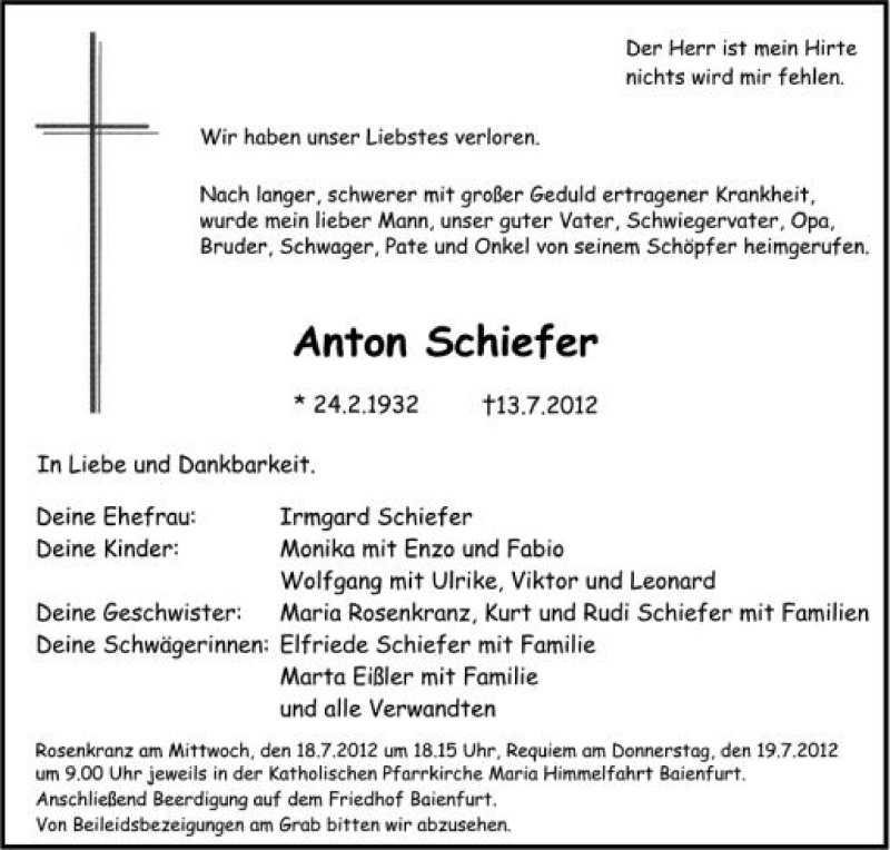 Hier finden Sie alle Traueranzeigen aus der Zeitung, die bisher für Anton Schiefer erschienen sind. Weitere Traueranzeigen, die in der Zeitung erscheinen, werden hier ebenfalls aufgelistet