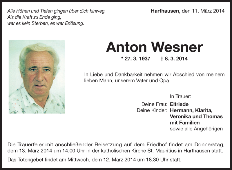 Hier finden Sie alle Traueranzeigen aus der Zeitung, die bisher für Anton Wesner erschienen sind. Weitere Traueranzeigen, die in der Zeitung erscheinen, werden hier ebenfalls aufgelistet