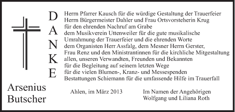 Hier finden Sie alle Traueranzeigen aus der Zeitung, die bisher für Arsenius Butscher erschienen sind. Weitere Traueranzeigen, die in der Zeitung erscheinen, werden hier ebenfalls aufgelistet