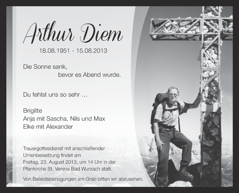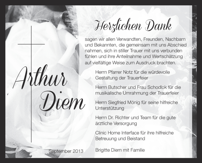 Hier finden Sie alle Traueranzeigen aus der Zeitung, die bisher für Arthur Diem erschienen sind. Weitere Traueranzeigen, die in der Zeitung erscheinen, werden hier ebenfalls aufgelistet