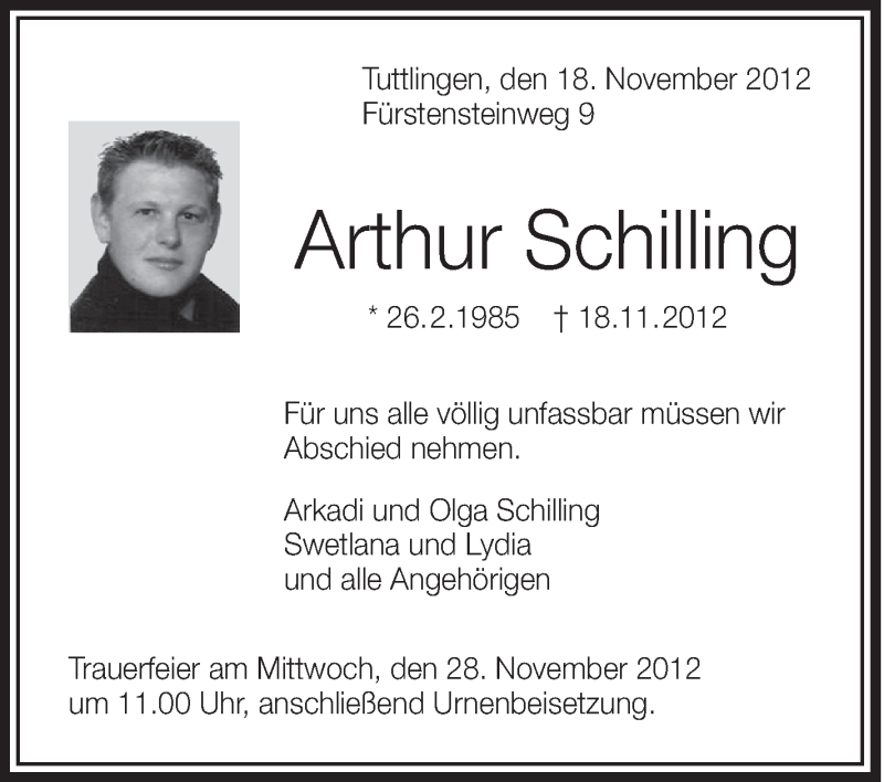 Hier finden Sie alle Traueranzeigen aus der Zeitung, die bisher für Arthur Schilling erschienen sind. Weitere Traueranzeigen, die in der Zeitung erscheinen, werden hier ebenfalls aufgelistet