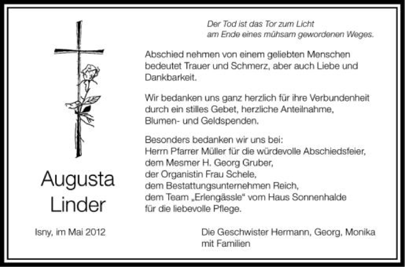 Hier finden Sie alle Traueranzeigen aus der Zeitung, die bisher für Augusta Linder erschienen sind. Weitere Traueranzeigen, die in der Zeitung erscheinen, werden hier ebenfalls aufgelistet