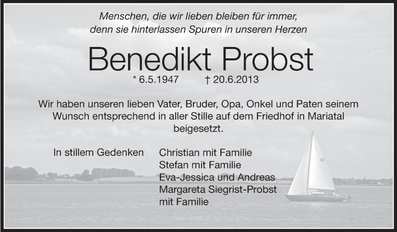 Hier finden Sie alle Traueranzeigen aus der Zeitung, die bisher für Benedikt Probst erschienen sind. Weitere Traueranzeigen, die in der Zeitung erscheinen, werden hier ebenfalls aufgelistet