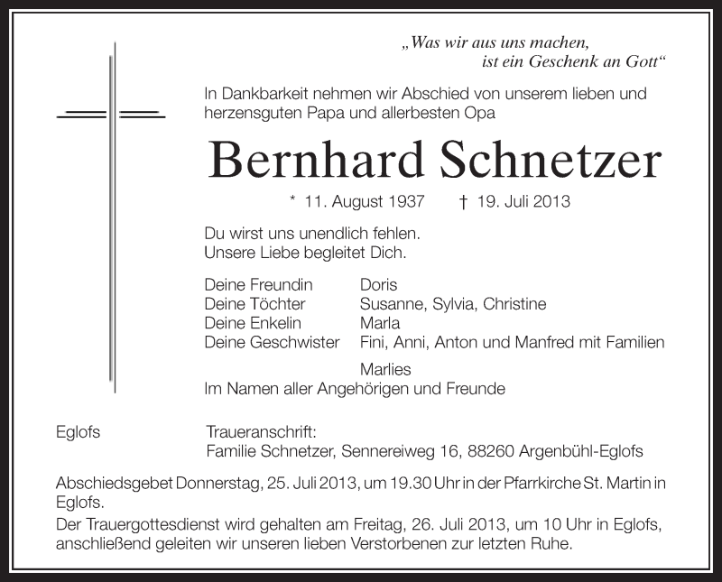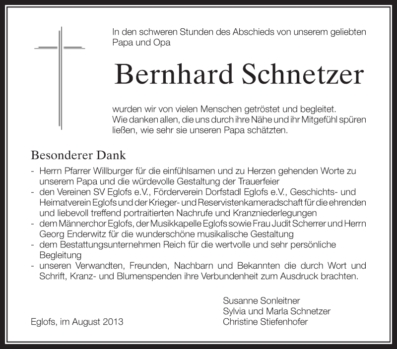 Hier finden Sie alle Traueranzeigen aus der Zeitung, die bisher für Bernhard Schnetzer erschienen sind. Weitere Traueranzeigen, die in der Zeitung erscheinen, werden hier ebenfalls aufgelistet