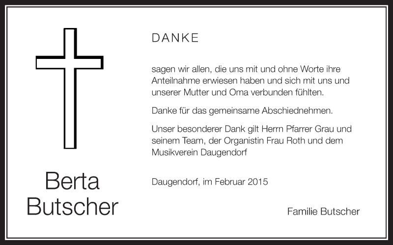 Hier finden Sie alle Traueranzeigen aus der Zeitung, die bisher für Berta Butscher erschienen sind. Weitere Traueranzeigen, die in der Zeitung erscheinen, werden hier ebenfalls aufgelistet
