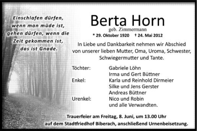 Hier finden Sie alle Traueranzeigen aus der Zeitung, die bisher für Berta Horn erschienen sind. Weitere Traueranzeigen, die in der Zeitung erscheinen, werden hier ebenfalls aufgelistet