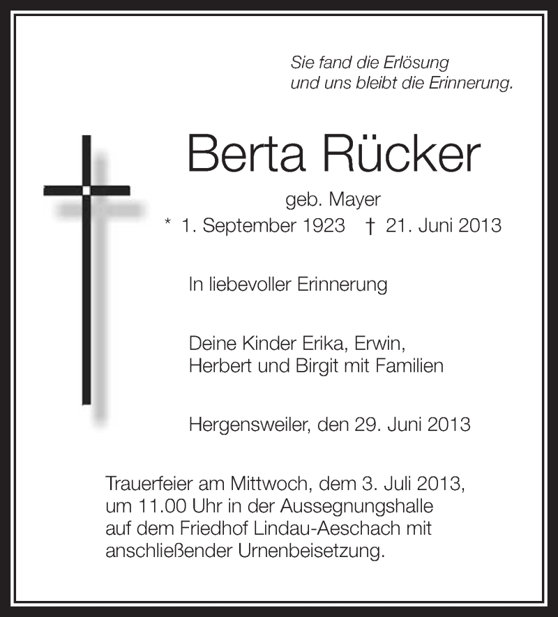 Hier finden Sie alle Traueranzeigen aus der Zeitung, die bisher für Berta Rücker erschienen sind. Weitere Traueranzeigen, die in der Zeitung erscheinen, werden hier ebenfalls aufgelistet