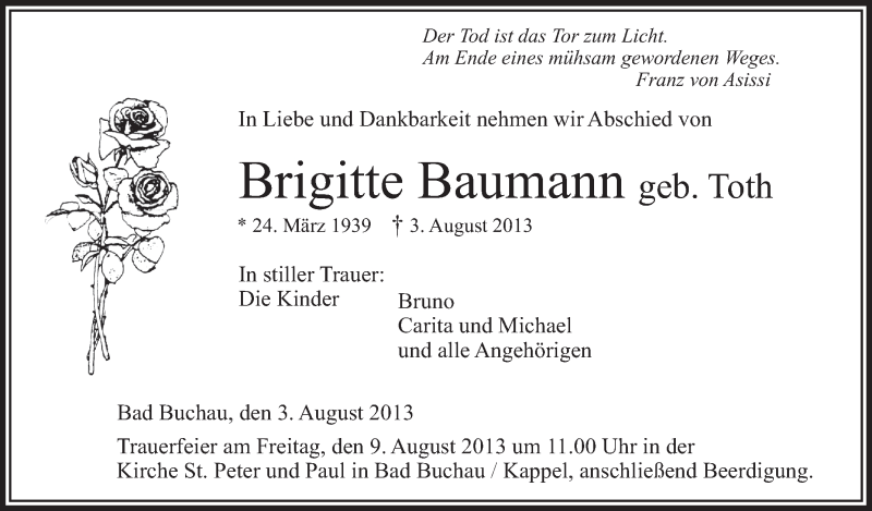 Hier finden Sie alle Traueranzeigen aus der Zeitung, die bisher für Brigitte Baumann erschienen sind. Weitere Traueranzeigen, die in der Zeitung erscheinen, werden hier ebenfalls aufgelistet