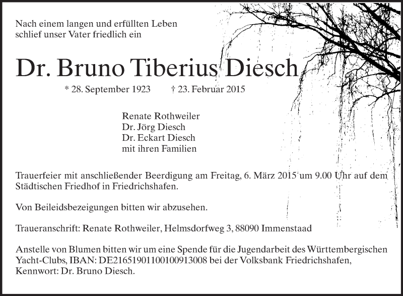 Hier finden Sie alle Traueranzeigen aus der Zeitung, die bisher für Bruno Tiberius Diesch erschienen sind. Weitere Traueranzeigen, die in der Zeitung erscheinen, werden hier ebenfalls aufgelistet