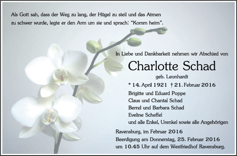 Hier finden Sie alle Traueranzeigen aus der Zeitung, die bisher für Charlotte Schad erschienen sind. Weitere Traueranzeigen, die in der Zeitung erscheinen, werden hier ebenfalls aufgelistet
