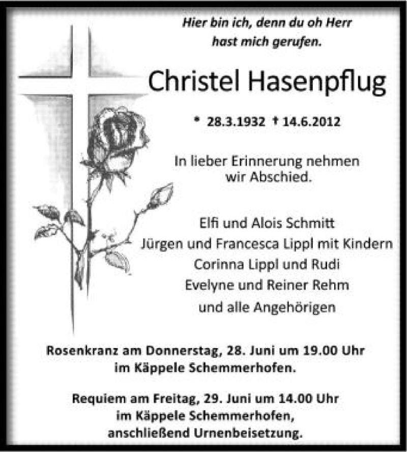 Hier finden Sie alle Traueranzeigen aus der Zeitung, die bisher für Christel Hasenpflug erschienen sind. Weitere Traueranzeigen, die in der Zeitung erscheinen, werden hier ebenfalls aufgelistet