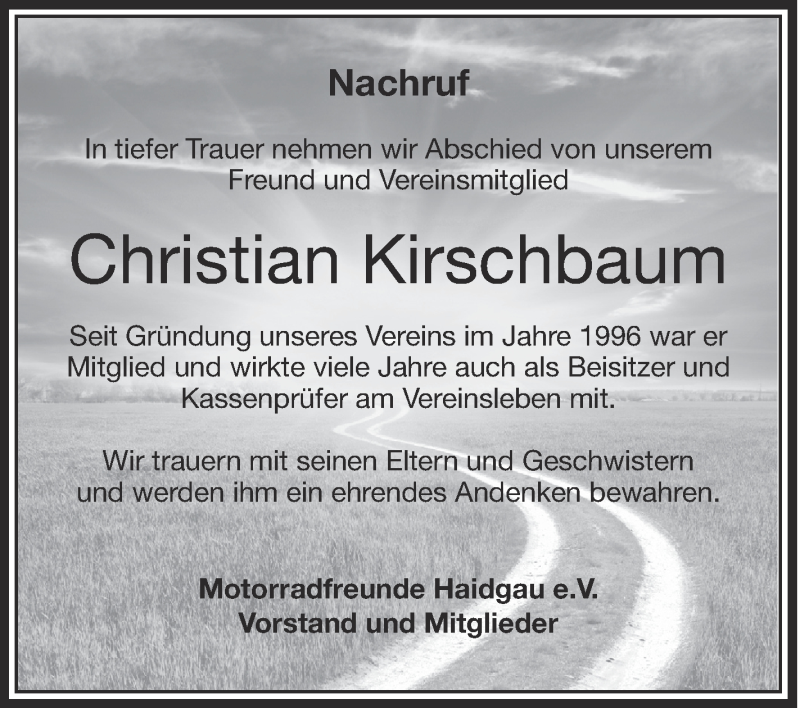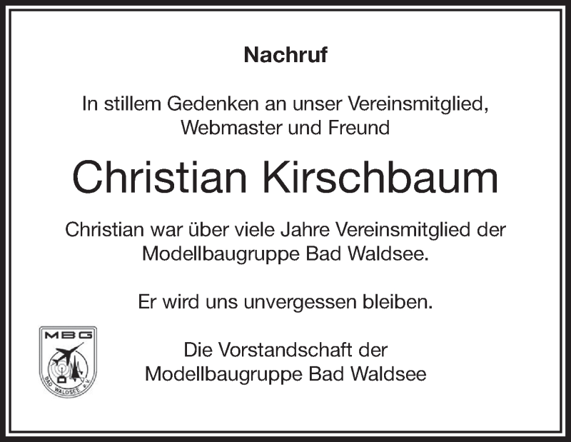 Hier finden Sie alle Traueranzeigen aus der Zeitung, die bisher für Christian Kirschbaum erschienen sind. Weitere Traueranzeigen, die in der Zeitung erscheinen, werden hier ebenfalls aufgelistet