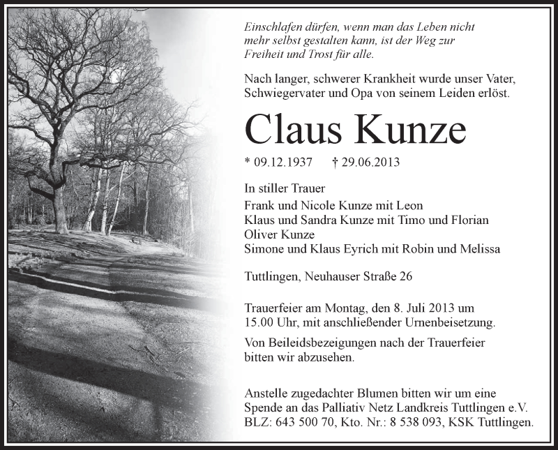 Hier finden Sie alle Traueranzeigen aus der Zeitung, die bisher für Claus Kunze erschienen sind. Weitere Traueranzeigen, die in der Zeitung erscheinen, werden hier ebenfalls aufgelistet
