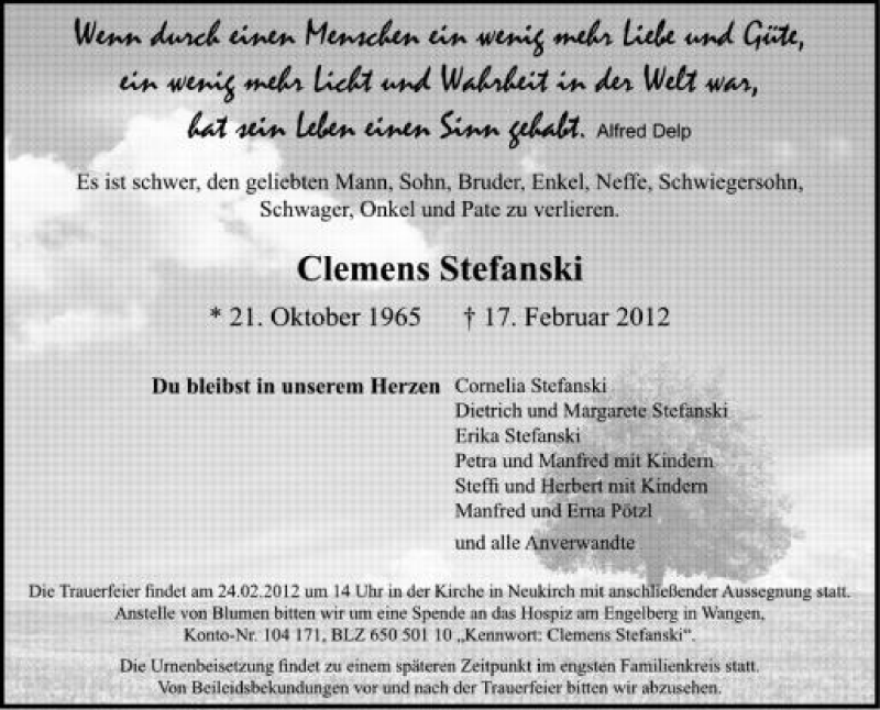 Hier finden Sie alle Traueranzeigen aus der Zeitung, die bisher für Clemens Stefanski erschienen sind. Weitere Traueranzeigen, die in der Zeitung erscheinen, werden hier ebenfalls aufgelistet