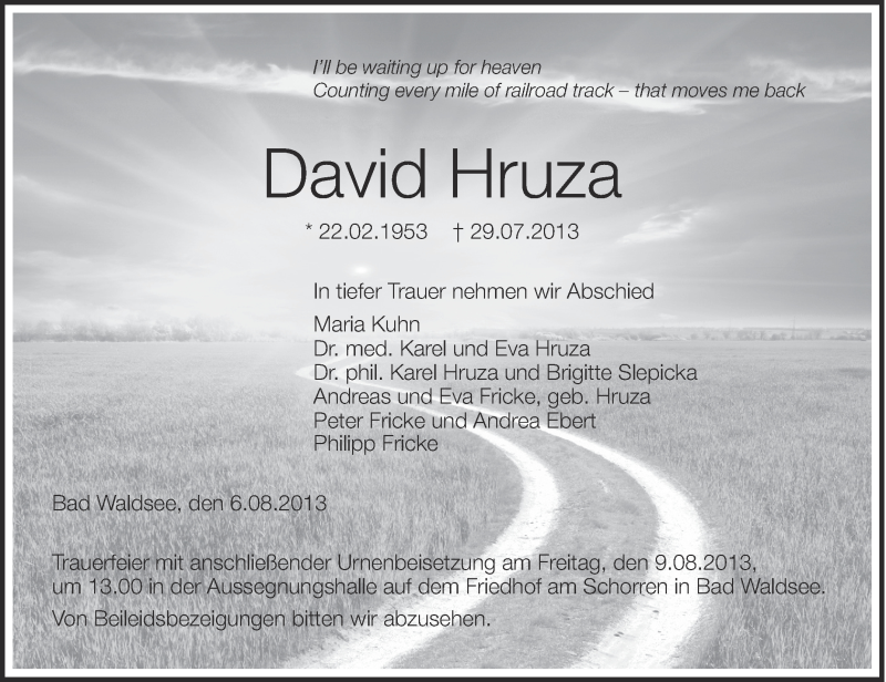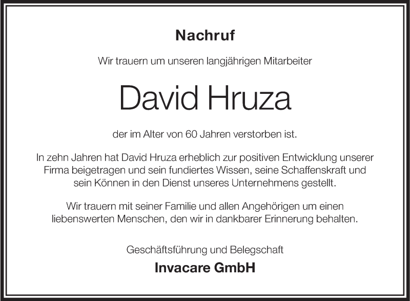 Hier finden Sie alle Traueranzeigen aus der Zeitung, die bisher für David Hruza erschienen sind. Weitere Traueranzeigen, die in der Zeitung erscheinen, werden hier ebenfalls aufgelistet