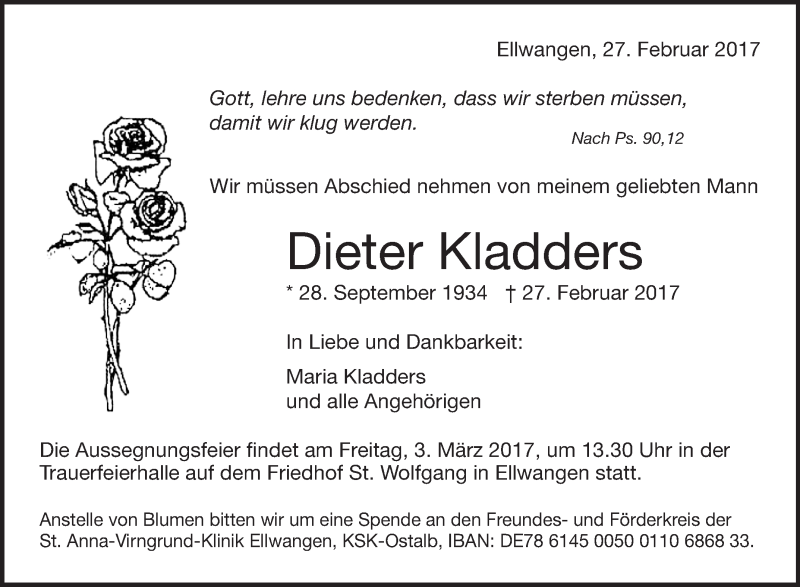 Hier finden Sie alle Traueranzeigen aus der Zeitung, die bisher für Dieter Kladders erschienen sind. Weitere Traueranzeigen, die in der Zeitung erscheinen, werden hier ebenfalls aufgelistet